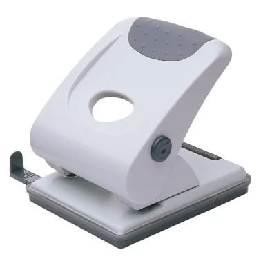 Muito resistente. 2 punções de 5 milímetros de diâmetro. Metal e carroceria pintada. Cor cinza. Com uma tira para ajustar a perfuração em A4, A5 e A6.